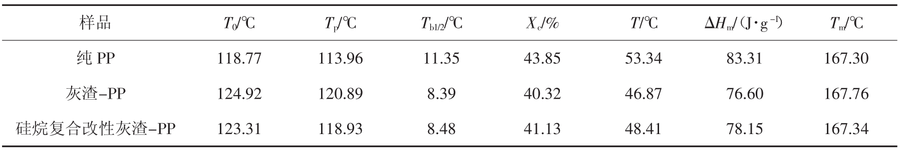 样品T0/℃Tp/℃Tb1/2/℃Xc/%T/℃ΔHm/(J·g-1)Tm/℃纯PP 118.77 113.96 11.35 43.85 53.34 83.31 167.30灰渣-PP 124.92 120.89 8.39 40.32 46.87 76.60 167.76硅烷复合改性灰渣-PP 123.31 118.93 8.48 41.13 48.41 78.15 167.34