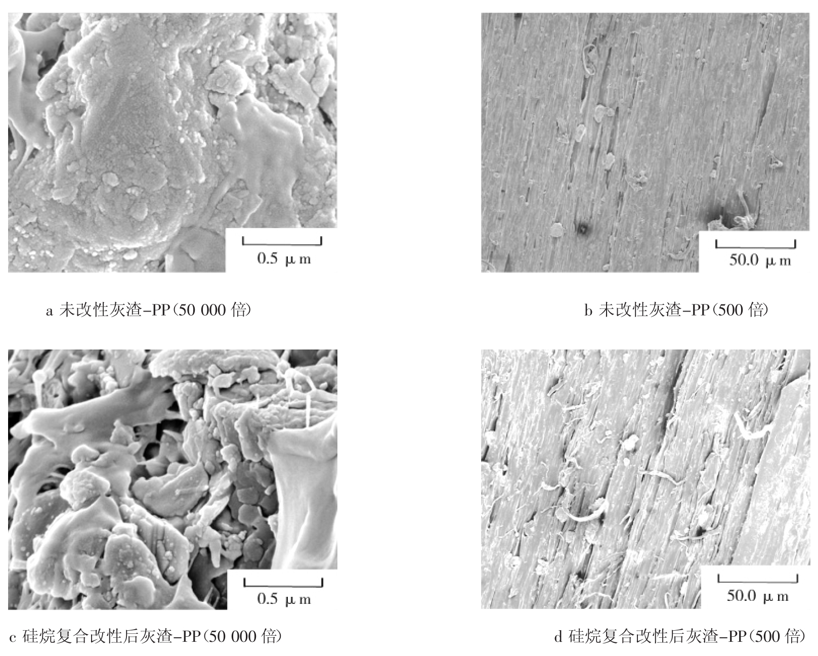图1为硅烷复合改性前后灰渣-PP复合材料拉伸断面的SEM图像。复合材料样条受拉伸作用后,改性后灰渣表面与PP分子链的结合力较改性前明显增强,PP分子与颗粒表面紧密结合,且没有出现大范围脱落致使颗粒表面暴露的现象。同时从样条断面结构看出,改性后的灰渣-PP复合材料拉伸断面较改性前整体起伏较大,表面结构丰富,凸凹性强,裂纹成撕裂状,且断面有明显的拉丝[13]。这说明经硅烷复合改性后,灰渣与PP界面作用增强,使得复合材料的韧性与强度均有提升。