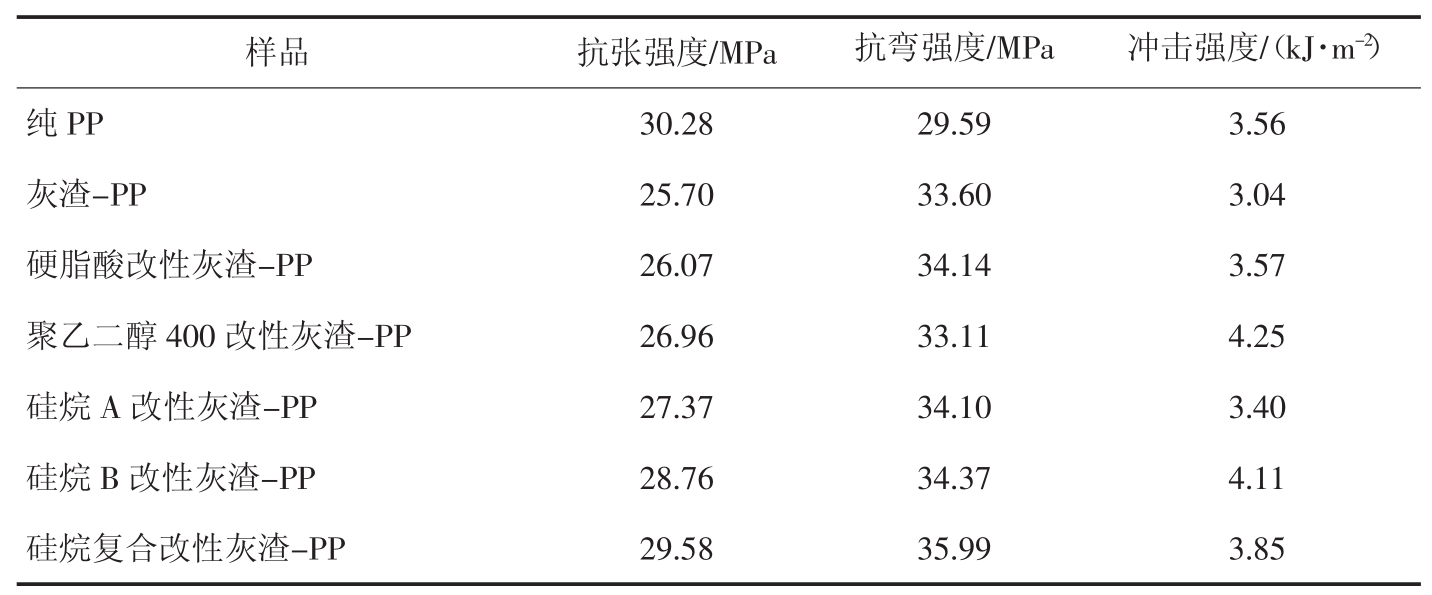 样品抗张强度/MPa抗弯强度/MPa冲击强度/(kJ·m-2)纯PP 30.28 29.59 3.56灰渣-PP 25.70 33.60 3.04硬脂酸改性灰渣-PP 26.07 34.14 3.57聚乙二醇400改性灰渣-PP 26.96 33.11 4.25硅烷A改性灰渣-PP 27.37 34.10 3.40硅烷B改性灰渣-PP 28.76 34.37 4.11硅烷复合改性灰渣-PP 29.58 35.99 3.85