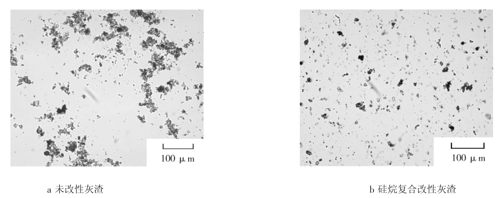 由于填充量较大,SEM图像并不能直观地反映灰渣颗粒在PP基体中的分散情况,因此本研究中将灰渣粉体加入液体石蜡中配置成质量浓度为5 g/L的溶液,超声振荡5 min后滴在载玻片上制得显微镜观察样品进行观察,以直观地确定灰渣在疏水性体系的分散情况。图2a、b分别为改性前后灰渣在液体石蜡中分散情况。