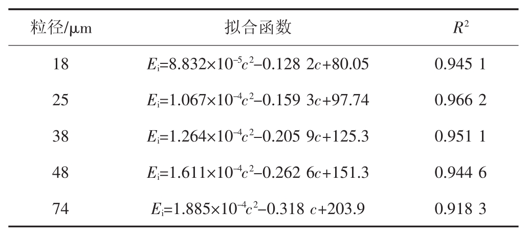 粒径/μm 拟合函数 R2 18 Ei=8.832×10-5c2-0.128 2c+80.05 0.945 1 25 Ei=1.067×10-4c2-0.159 3c+97.74 0.966 2 38 Ei=1.264×10-4c2-0.205 9c+125.3 0.951 1 48 Ei=1.611×10-4c2-0.262 6c+151.3 0.944 6 74 Ei=1.885×10-4c2-0.318 c+203.9 0.918 3