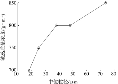 钛粉质量浓度敏感值随钛粉粒径的变化规律如图3所示。由图可知,钛粉的敏感质量浓度与钛粉粒径呈正相关。这是由于粒径小的钛粉颗粒更易热解为可燃气体,粒径偏大的粉尘颗粒如需热解产生质量浓度相当的可燃气体,就需要质量浓度更高的钛粉,因此,钛粉的敏感质量浓度随中位粒径的增大而增大。