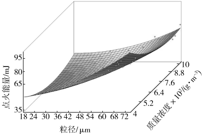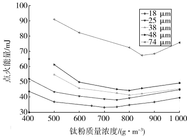 2)点火能量随钛粉质量浓度的增大以二次函数的形式先减后增,随粒径的增大以二次函数的形式增大。钛粉的敏感质量浓度与钛粉粒径呈正相关。