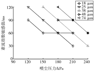 3)紊流指数敏感值与喷尘压力呈负相关。喷尘压力不变,粒径越大,紊流指数敏感值越大。紊流指数不变,钛粉粒径越大,喷尘压力敏感值越大。