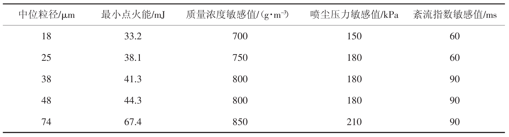 中位粒径/μm最小点火能/mJ质量浓度敏感值/(g·m-3)喷尘压力敏感值/kPa紊流指数敏感值/ms 18 33.2 700 150 60 25 38.1 750 180 60 38 41.3 800 180 90 48 44.3 800 180 90 74 67.4 850 210 90