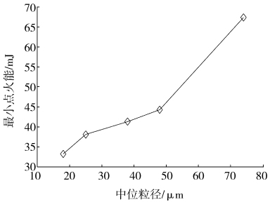 由图4可知,最小点火能随粒径的增大以二次函数的形式增大。这是由于粒径小的钛粉颗粒比表面积较大,和氧气接触面积偏大,反应速率更快,产生的热量进一步传递给未着火的钛粉颗粒,增大了火焰传播的速率,因此最小点火能减小。
