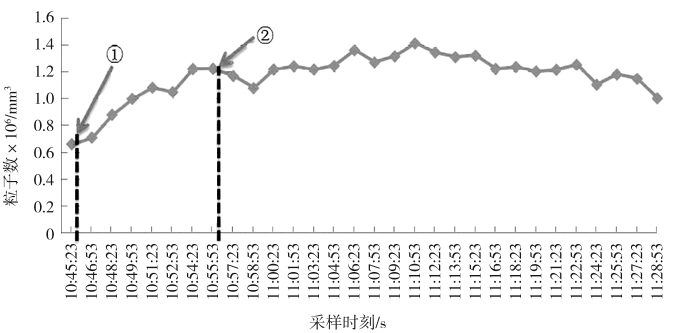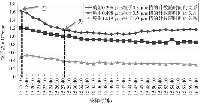 图9为分别用粒径为 0.296、0.498、1.019 μm 的PSL粒子测试SPG系统所得到粒子数随时间变化的曲线图,图10是用2.995 μm的PSL粒子测试SPG系统得到粒子数随时间变化的曲线图。其中虚线①表示系统启动后,料子计数器首次采样结束的时刻线,虚线②是启动10 min后的。