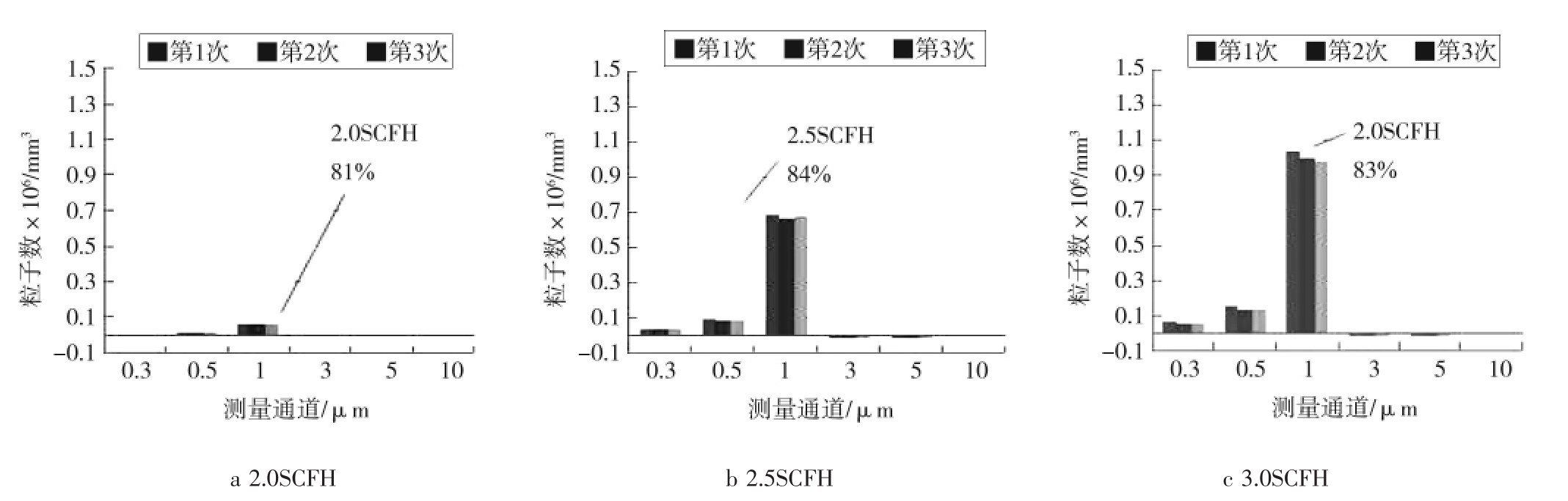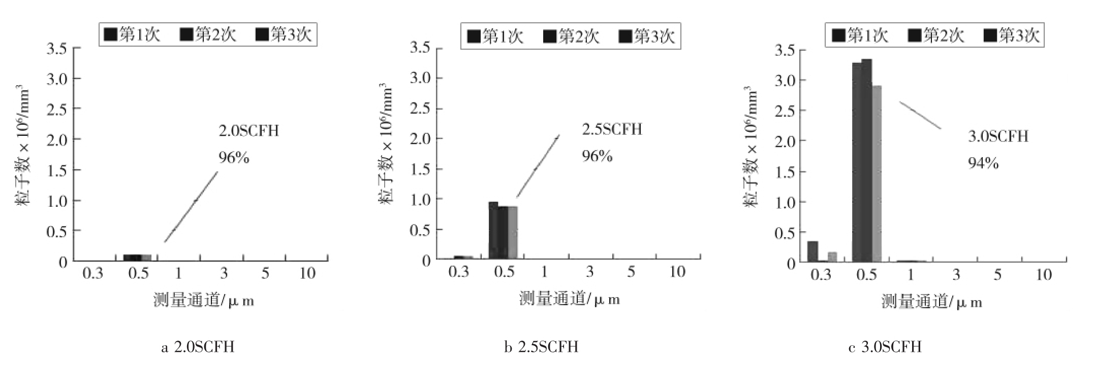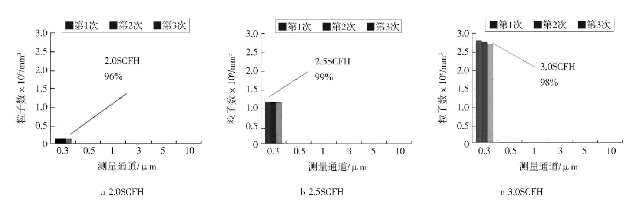 实验条件1:稀释液的粒子数浓度:0.296 μm的为 1.33×107mL-1;0.498 μm 的为 2×107mL-1;1.019 μm的为 2.67×107mL-1;2.995 μm 的为 1.67×106mL-1。干燥气体流量计调为50.0SCFH,喷雾器稀释液流量计分别调为2.0SCFH、2.5SCFH和3.0SCFH。采样的激光尘埃粒子计数器型号为Kanomax3905,采样时间为1 min,采样次数为3,测量方式为单管测量。