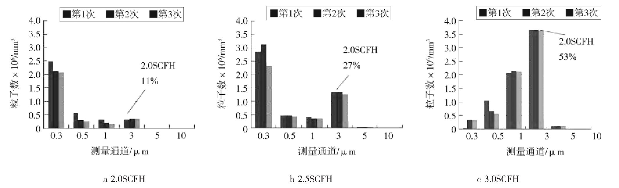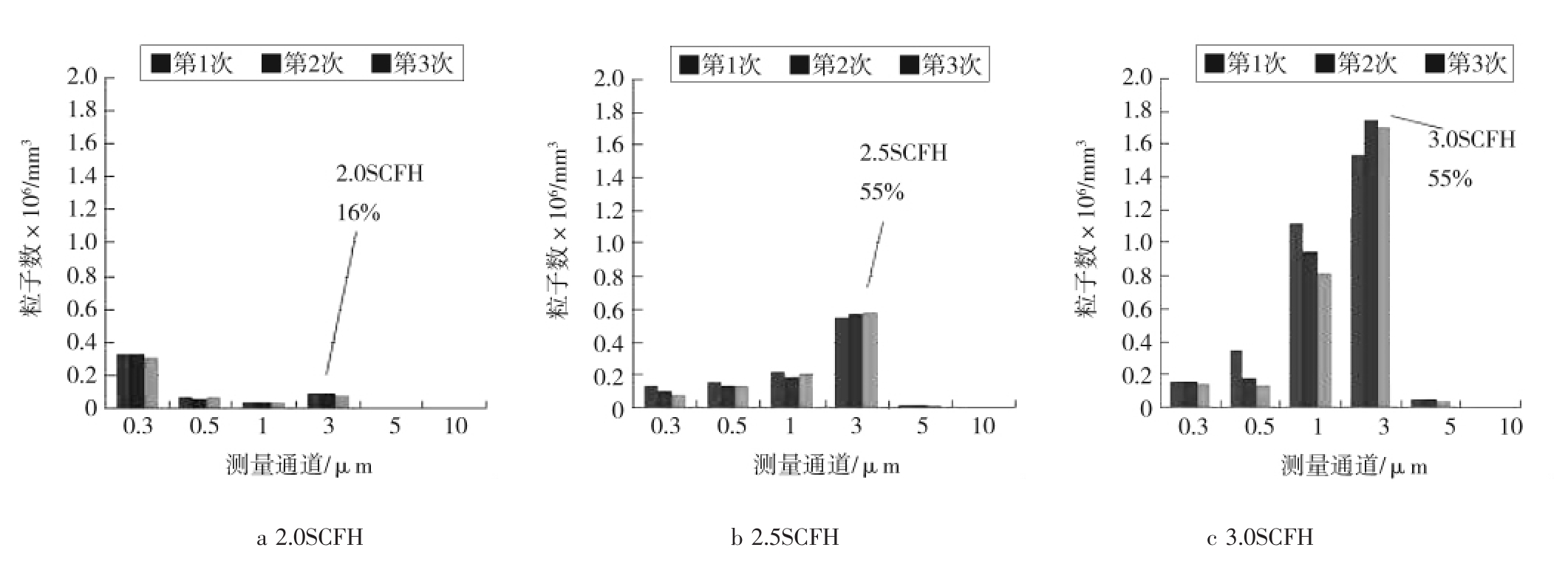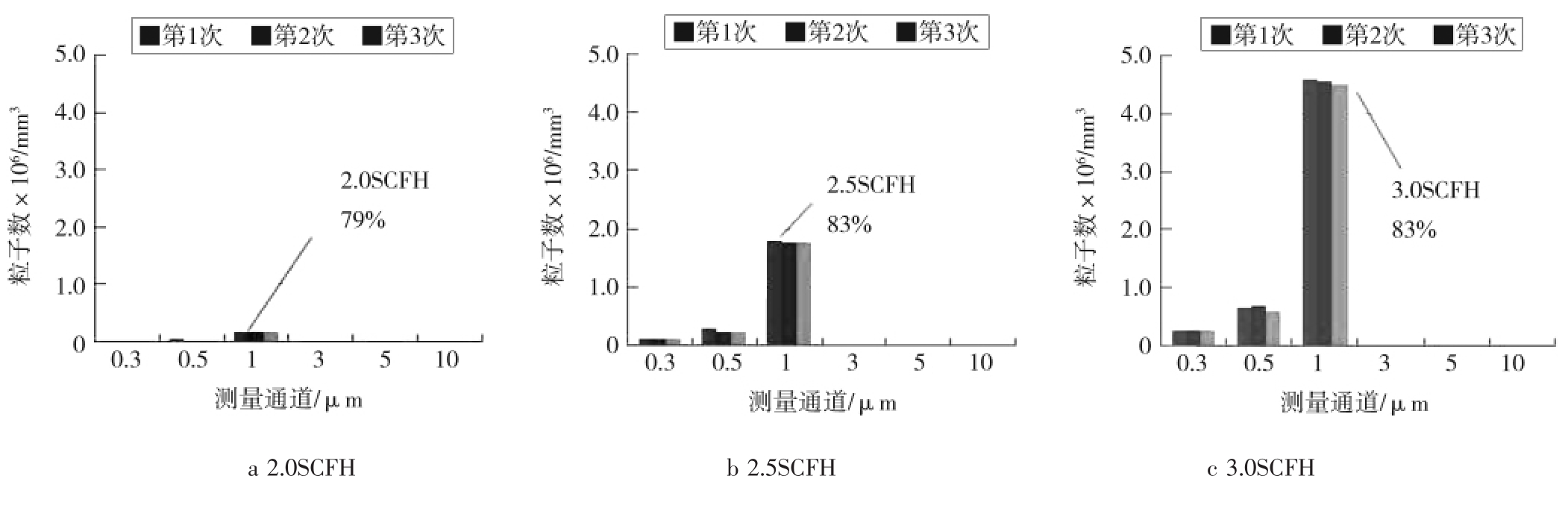 实验条件1:稀释液的粒子数浓度:0.296 μm的为 1.33×107mL-1;0.498 μm 的为 2×107mL-1;1.019 μm的为 2.67×107mL-1;2.995 μm 的为 1.67×106mL-1。干燥气体流量计调为50.0SCFH,喷雾器稀释液流量计分别调为2.0SCFH、2.5SCFH和3.0SCFH。采样的激光尘埃粒子计数器型号为Kanomax3905,采样时间为1 min,采样次数为3,测量方式为单管测量。