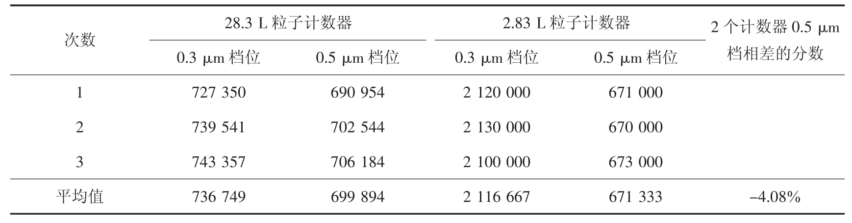 次数28.3 L粒子计数器 2.83 L粒子计数器 2个计数器0.5 μm档相差的分数0.3 μm档位 0.5 μm档位 0.3 μm档位 0.5 μm档位727 350 690 954 2 120 000 671 000 2 739 541 702 544 2 130 000 670 000 3 743 357 706 184 2 100 000 673 000平均值 736 749 699 894 2 116 667 671 333 -4.08%1