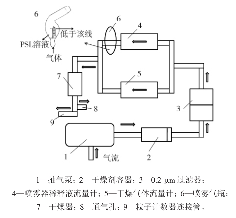 图1为SPG的结构示意图。SPG正常工作时,抽气泵将外界的气流带进管路,经干燥、过滤后分2路:一路通过喷雾器稀释液流量计进入到喷雾器瓶,喷雾器瓶内盛有PSL标准粒子稀释液,气流由下往上将稀释液吹至管壁处,经溅射、雾化后从瓶口出射;另一路气流通过干燥气体流量计后在干燥器中与喷雾瓶出射的雾化PSL稀释液相汇,干燥过后,带有PSL粒子的气流从图1中9处管道进入到外接的粒子计数器中。