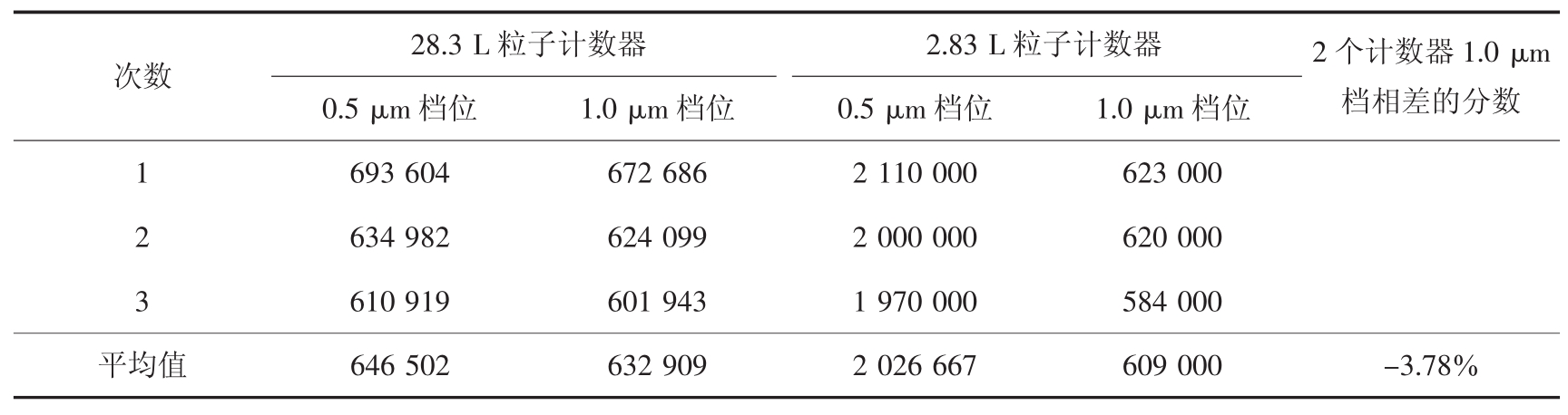 28.3 L粒子计数器 2.83 L粒子计数器 2个计数器1.0 μm档相差的分数0.5 μm档位 1.0 μm档位 0.5 μm档位 1.0 μm档位1 693 604 672 686 2 110 000 623 000 2 634 982 624 099 2 000 000 620 000 3 610 919 601 943 1 970 000 584 000平均值 646 502 632 909 2 026 667 609 000 -3.78%次数