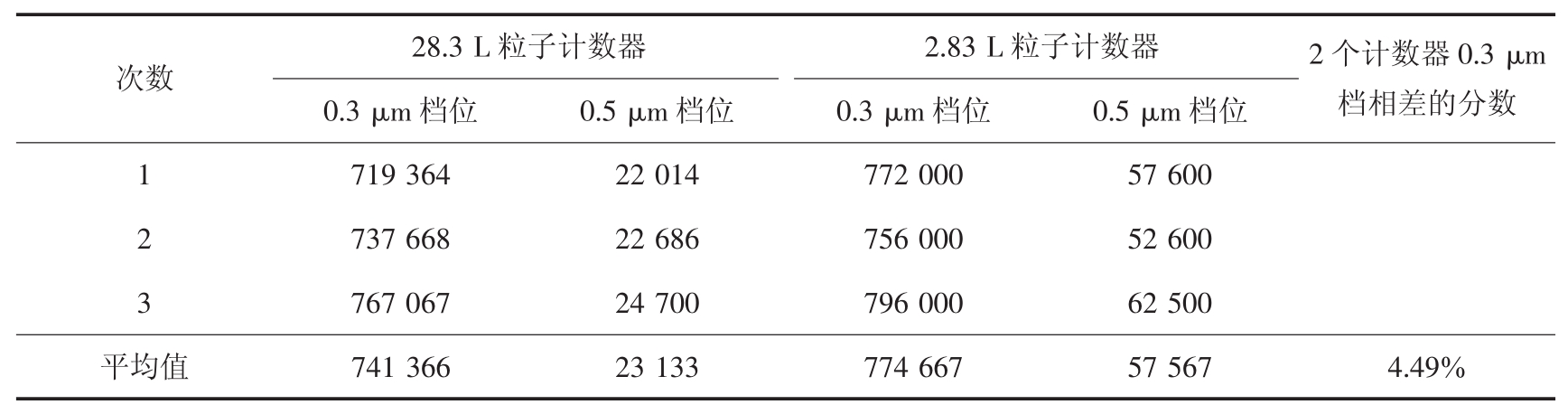 次数28.3 L粒子计数器 2.83 L粒子计数器 2个计数器0.3 μm档相差的分数0.3 μm档位 0.5 μm档位 0.3 μm档位 0.5 μm档位719 364 22 014 772 000 57 600 2 737 668 22 686 756 000 52 600 3 767 067 24 700 796 000 62 500平均值 741 366 23 133 774 667 57 567 4.49%1