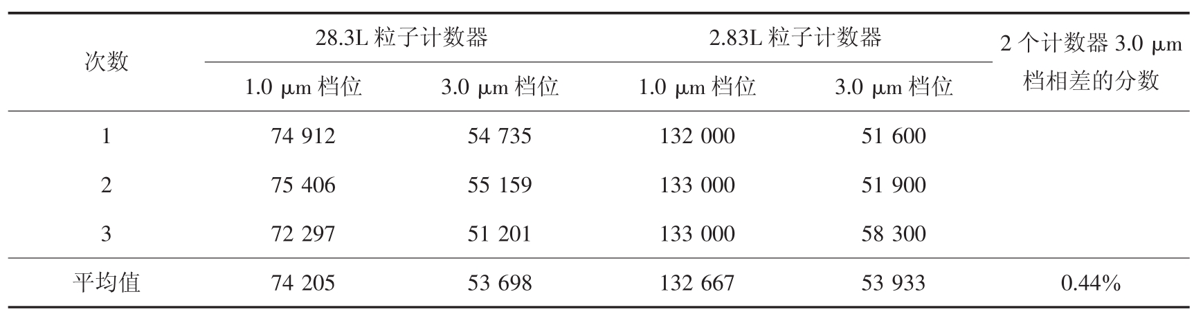 28.3L粒子计数器 2.83L粒子计数器 2个计数器3.0 μm档相差的分数1.0 μm档位 3.0 μm档位 1.0 μm档位 3.0 μm档位1 74 912 54 735 132 000 51 600 2 75 406 55 159 133 000 51 900 3 72 297 51 201 133 000 58 300平均值 74 205 53 698 132 667 53 933 0.44%次数