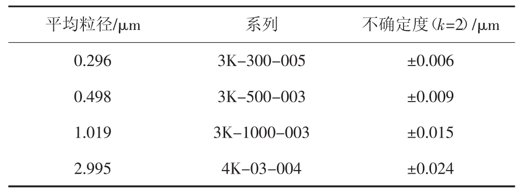 平均粒径/μm 系列 不确定度(k=2)/μm 0.296 3K-300-005 ±0.006 0.498 3K-500-003 ±0.009 1.019 3K-1000-003 ±0.015 2.995 4K-03-004 ±0.024