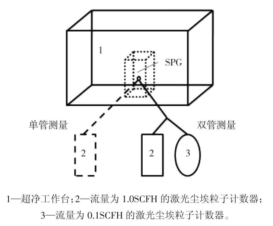 PSL稀释液配置:将上述4种PSL原液分别滴入到高纯水中,配置成具有不同含量的PSL稀释液,再装入SPG喷雾器瓶中。为了防止SPG产生的粒子被外界环境的颗粒物所污染,整台SPG置于超净工作台中。测量方式分2种,即单管测量和双管测量。单管测量时,SPG的PSL粒子出射管道直接连接流量为1.0SCFH(标准立方英尺每小时)的激光尘埃粒子计数器或0.1SCFH的激光尘埃粒子计数器。双管测量时,SPG的PSL粒子出射管道经一个三叉管分为2路,一路连接流量为1.0SCFH的激光尘埃粒子计数器,另一路连接流量为0.1SCFH的激光尘埃粒子计数器(如图2所示)。所用的1.0SCFH的激光尘埃粒子计数器型号为Kanomax3905,所用的0.1SCFH的激光尘埃粒子计数器型号为Kanomax3886,主要参数见表2。