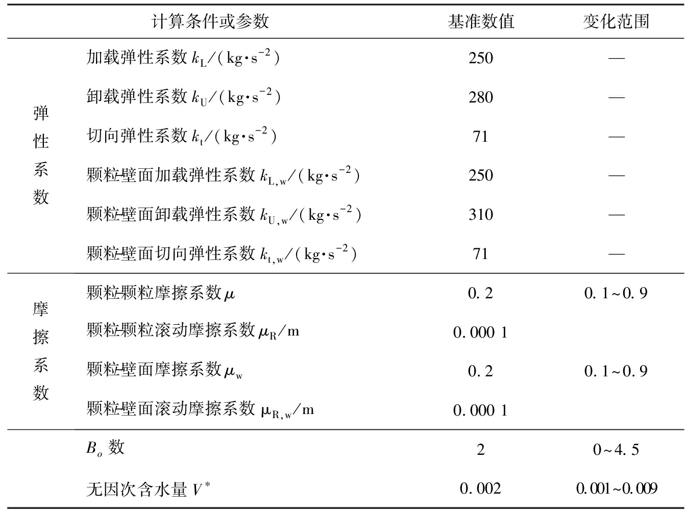 计算条件或参数基准数值变化范围弹性系数加载弹性系数kL/(kg·s-2)250—卸载弹性系数kU/(kg·s-2)280—切向弹性系数kt/(kg·s-2)71—颗粒-壁面加载弹性系数kL,w/(kg·s-2)250—颗粒-壁面卸载弹性系数kU,w/(kg·s-2)310—颗粒-壁面切向弹性系数kt,w/(kg·s-2)71—摩擦系数颗粒-颗粒摩擦系数μ0.20.1~0.9颗粒-颗粒滚动摩擦系数μR/m0.000 1颗粒-壁面摩擦系数μw0.20.1~0.9颗粒-壁面滚动摩擦系数μR,w/m0.000 1Bo数20~4.5无因次含水量V∗0.0020.001~0.009