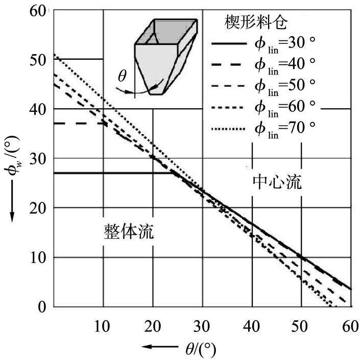 图1即为楔形料仓以及给定物料内摩擦角下的Jenike设计图之一。