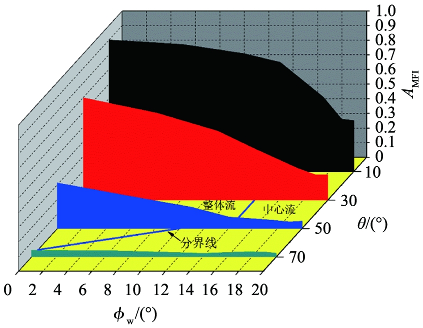 图5为模拟所得的不同半顶角以及壁面摩擦角时的卸料流型并与Jenike设计图表对比的三维图。其中,分布在黄色平面上的蓝色线代表Jenike提出的中心流与整体流分界线,图中为内摩擦角15 °的分界线。由图可知,半顶角不变时,其AMFI数值都是随着湿颗粒壁面摩擦角的增大而减小。壁面摩擦角恒定时,半顶角越小,其AMFI值越大。这是因为,湿颗粒由料仓的垂直部分流动到收缩段时,颗粒每下降一个微小的高度,都要重新排列,颗粒的原有层面呈不均匀下降,以适应截面收缩的变化。料仓半顶角越大,颗粒越接近出口,颗粒间的挤压现象越明显,边壁处的颗粒速度较慢,中心处颗粒速度较大,其AMFI越小。半顶角越大,边壁与中心处的速度差越大,AMFI也越小。此外,模拟所得的三维图显示的总体趋势是比较大的AMFI分布于黄色平面左上角,比较小的AMFI则位于右下角,这与Jenike理论预测结果类似,见图1所示。但是,模拟所得的整体流与中心流的分界线与Jenike所提出的分界线有所不同。Jenike理论所预测的整体流与中心流分界线由2条斜率不同的直线分段表示。相反,模拟预测所得分界线是一连续曲线,Jenike预测的整体流的范围是朝着黄色平面左上角一较小的范围,因此,对整体流和中心流转变预测比较保守,而模拟预测范围则较大。