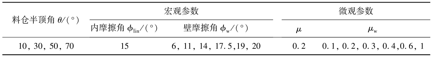 为了将模拟结果与图1的Jenike设计图表进行对比以验证模拟的正确性,采用文献[6,18-19]所建立起来的微观摩擦与宏观摩擦之间的联系来选取模拟中所要用到的微观摩擦系数。表2总结了模拟中所用到的微观参数以及相应的宏观参数。