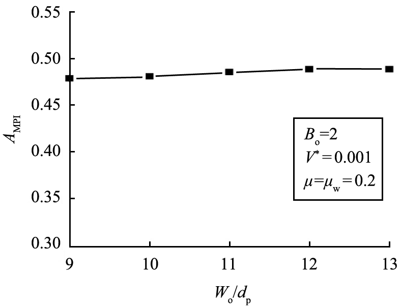 图8为无因次含液量对AMFI变化情况的影响图。由图可以看出,在料仓结构尺寸不变,颗粒物性不变的情况下,改变无因次含水量,其AMFI值变化不大,且流型仍为整体流。这是因为虽然含水量增加,但其湿颗粒-颗粒摩擦系数、颗粒壁面摩擦系数不变,表现在宏观参数上,其内摩擦角和壁摩擦角都不变,所以,在保持料仓结构、颗粒物性不变的情况下,含水量增加,对AMFI值的影响很小。