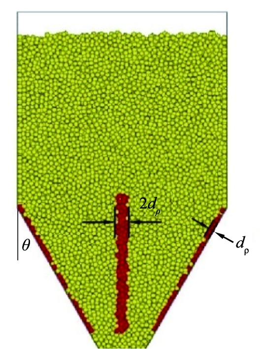 Ketterhagen等[6]采用离散单元法系统研究了干颗粒从圆柱形料仓以及楔形料仓中的卸料流型,旨在从颗粒尺度研究颗粒特性、料仓结构对卸料流型的影响规律。刘杰[7]用实验方法分析了9种物料在料仓中的重力卸料流型,重点研究了粒径和料仓半顶角对卸料流型的影响规律,半顶角越小,粒径越大,越容易获得整体流。陶贺等[8]研究了椭球形干颗粒在移动床内的流动特性,采用离散元法分析了椭球干颗粒物性对卸料流型的影响规律。