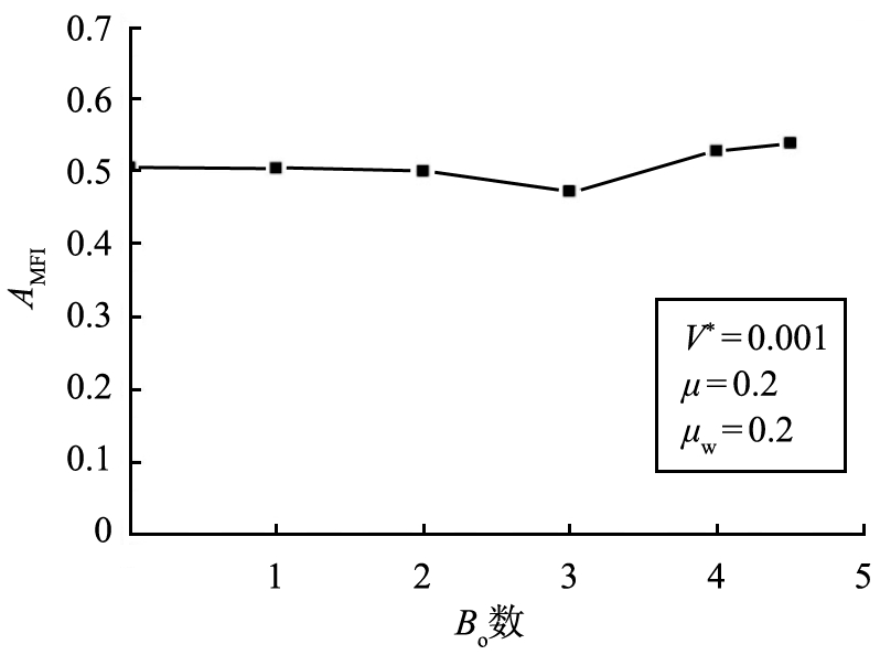 图7表示Bo数对料仓卸料流型AMFI变化情况的影响。由图可以看出,在料仓结构尺寸不变,湿颗粒物性不变的情况下,随着Bo数增大,其AMFI略有减小后增大,但整体变化幅度不大,且流型仍为整体流。