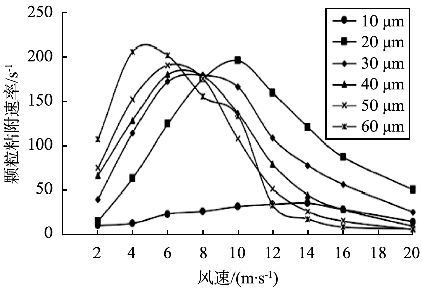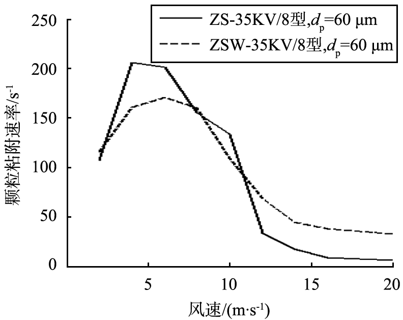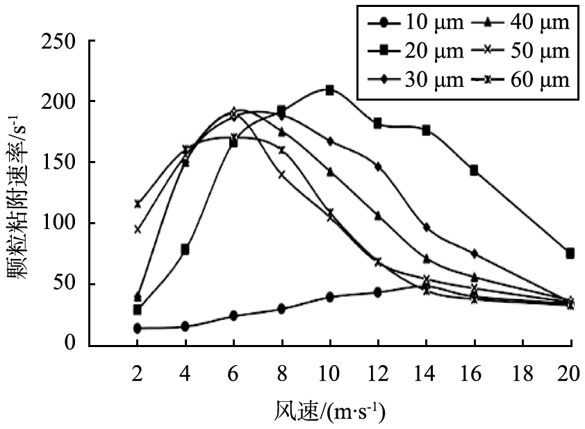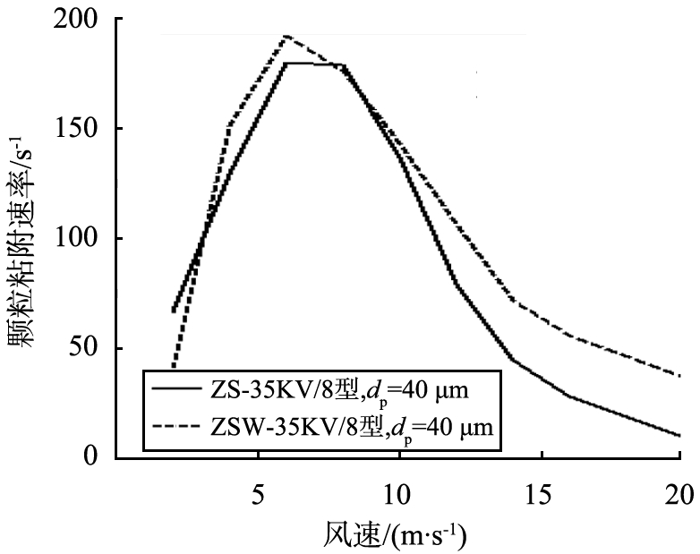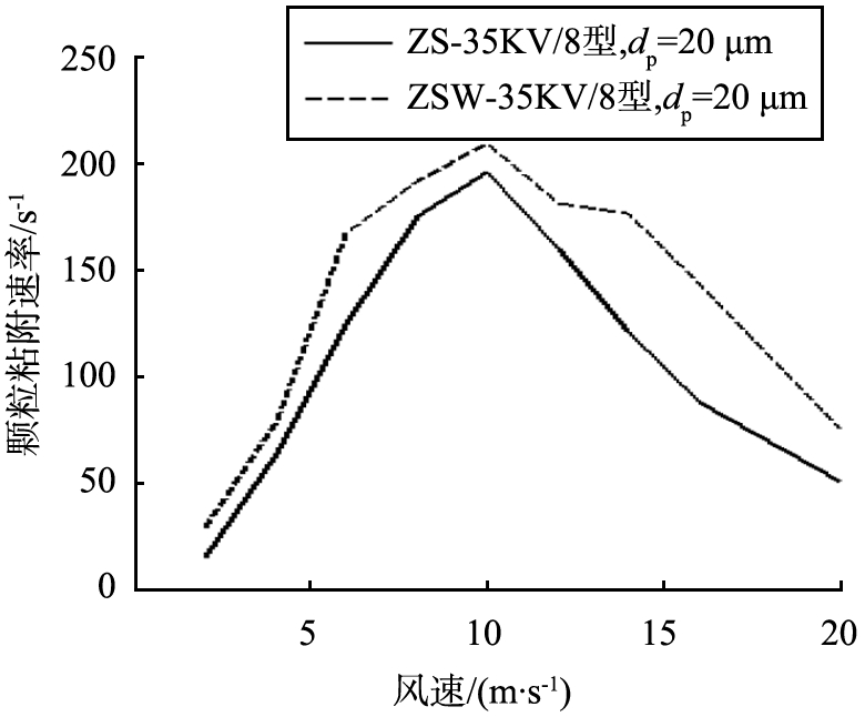 图8为颗粒在绝缘子表面粘附速率随风速变化图。从图中可以看出,随着水平风速的增加,颗粒在绝缘子表面粘附速率先逐渐增大,风速达到一定值后,粘附速率开始减小。