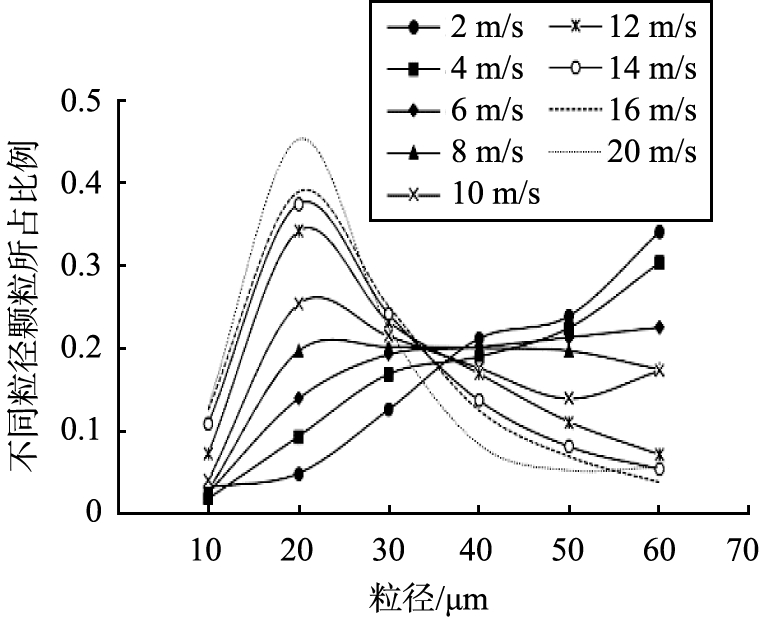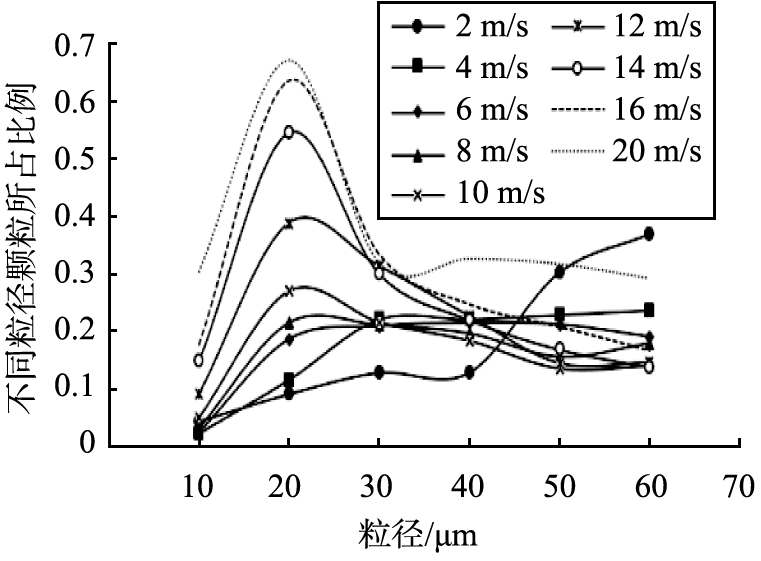 图11为粘附在绝缘子表面不同粒径颗粒所占比例。 当风度较小时,污秽颗粒占比随着颗粒粒径的增加逐渐增大;当风速达到8 m/s左右时,20 μm以上污秽颗粒为主要成分;在风速较大时,可以看到粒径较大颗粒所占比例明显下降,而粒径小的颗粒开始增多,粒径为20 μm左右的颗粒所占的比例最大;这是因为当风速较小时,粒径很小的颗粒受流体作用明显,易随流体绕流离开绝缘子,而粒径较大的颗粒主要受颗粒与绝缘子的碰撞作用力离开绝缘子;在风速很小的天气状况下,粘附在绝缘子表面的灰尘颗粒的粒径大都在50 μm之下。