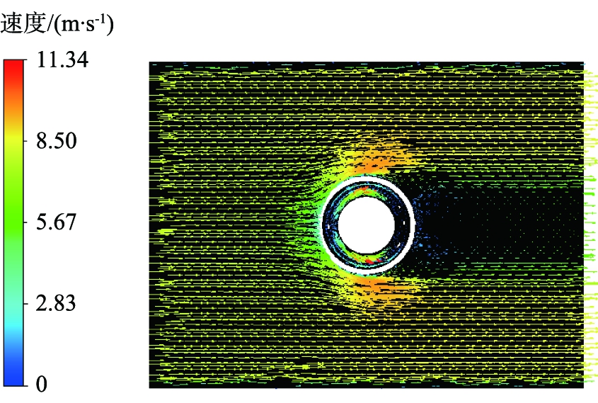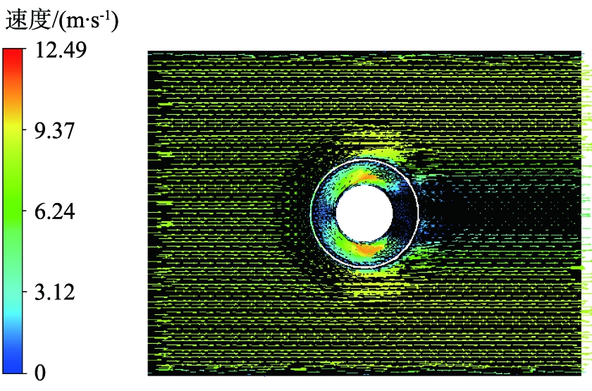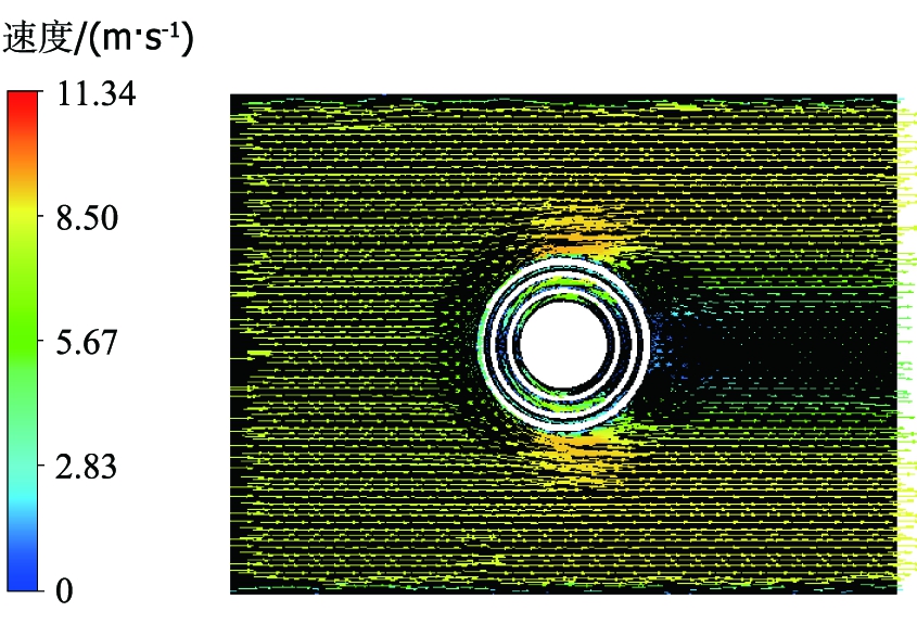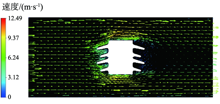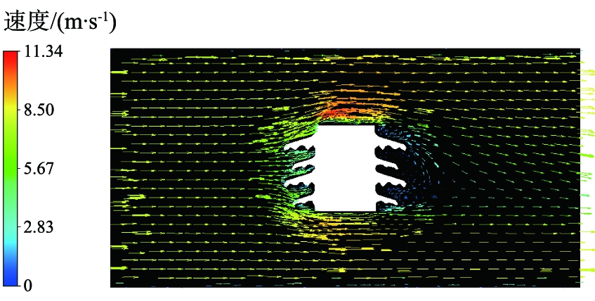 图6为有凸棱绝缘子速度平面矢量图。由图可以看出,下表面有凸棱的绝缘子在绝缘子背风面产生的涡流现象更加严重,颗粒更容易沉积。