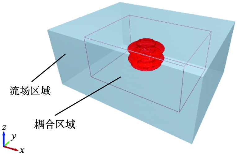 基于本文的DEM-CFD耦合仿真的方法,需要分别在FLUENT和EDEM软件中设置仿真区域。为了确保绝缘子附近流场的准确性,同时减小计算时间,将FLUENT中的流场范围设置为绝缘子直径的5倍,计算域设为800 mm×600 mm×410 mm。为了不影响颗粒在绝缘子表面的粘附过程,同时考虑运算时间,将耦合区域设置在流场域之类,其范围为550 mm×410 mm×255 mm。仿真计算域如图3所示。