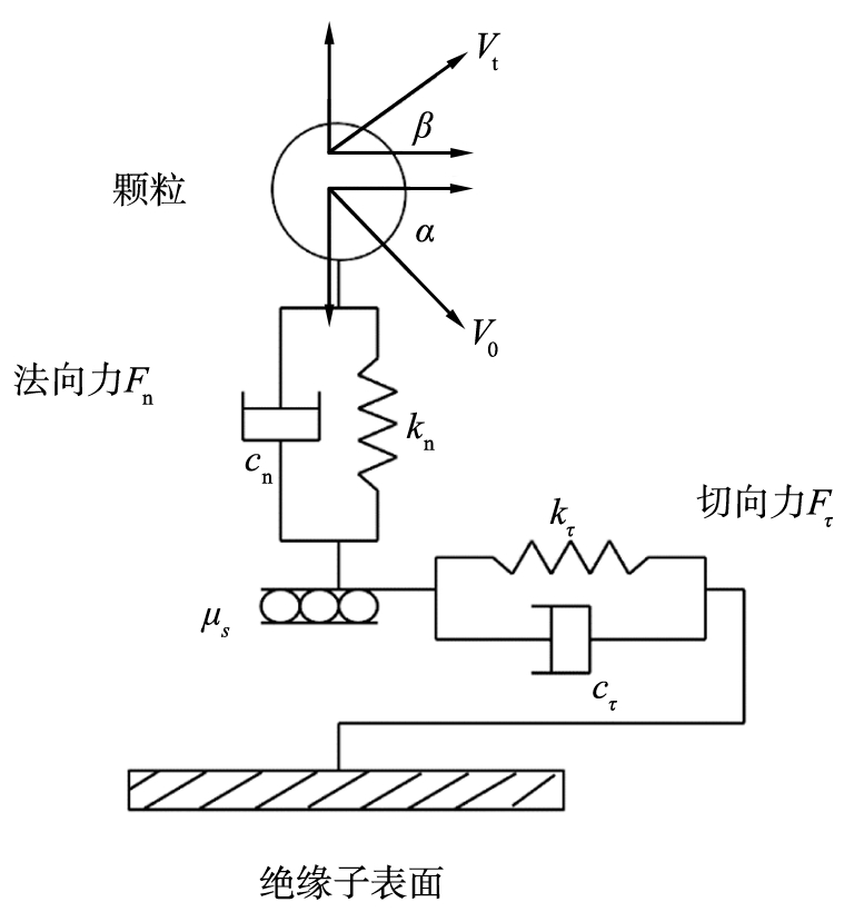 目前绝缘子的积污方面的研究主要通过风洞试验的CFD方法来进行。在实验研究方面,学者通过结合风洞实验和自然积污的方法进行积污实验[9-12],但是风洞试验中如何替代非常小的颗粒存在较大难度,而且在积污的过程中存在时间长,条件不易达到等缺点;CFD方法[13]只能模拟颗粒在流场中的运动,并不能有效地反映颗粒与绝缘子表面的接触粘附特性。为了更好地研究绝缘子的积污特性,本文中使用了CFD和DEM耦合的方法模拟绝缘子的积污过程。 根据Hertz理论和Mindlin-Deresiewicz理论,建立如图1所示的颗粒和绝缘子接触模型。
