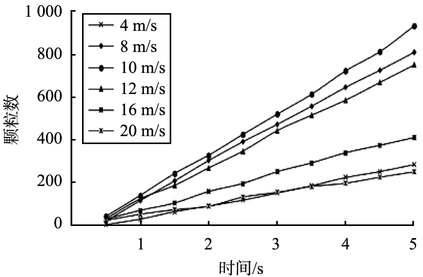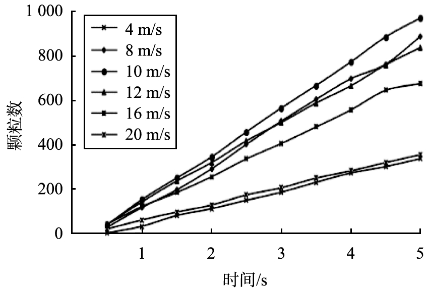 风速的大小很大程度上决定了颗粒在绝缘子表面的粘附状态。图7为绝缘子表面粘附颗粒数随时间变化图。从图中可以看出,在一定时间范围内,绝缘子表面粘附颗粒随着时间的增加逐渐增多。