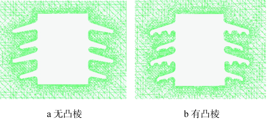 在绝缘子的积污方面,许多学者都做出了研究[2-8],但是没有对颗粒与绝缘子的碰撞粘附过程进行研究,没有进行这方面的数值模拟仿真。 本文中的研究对象为表面有、无凸棱2种支柱型绝缘子,使用流体动力学和颗粒离散元耦合的方法可视化地研究颗粒在绝缘子表面的积污过程,同时文中结合了颗粒和绝缘子接触时表面能的影响,能够更加准确地描述颗粒与绝缘子的接触粘附过程,从而更好地研究颗粒在绝缘子表面动态沉积特性。