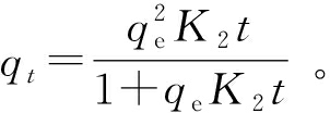 式中: qt为t时刻LDH材料对I-的吸附量,mg/g; t为吸附时间,min;K1为一级动力学常数,min-1; K2为二级动力学常数,g·mg-1·min-1。