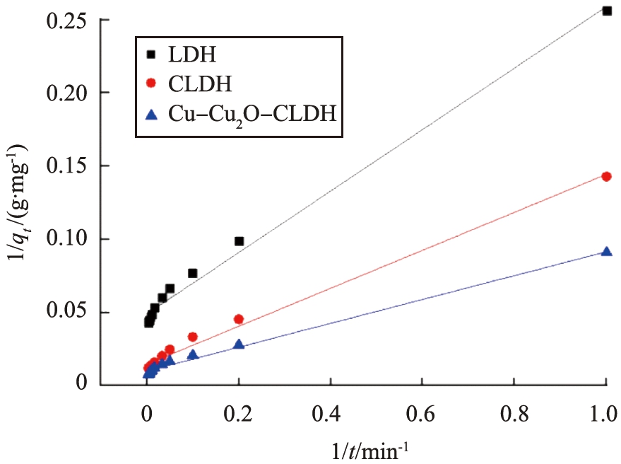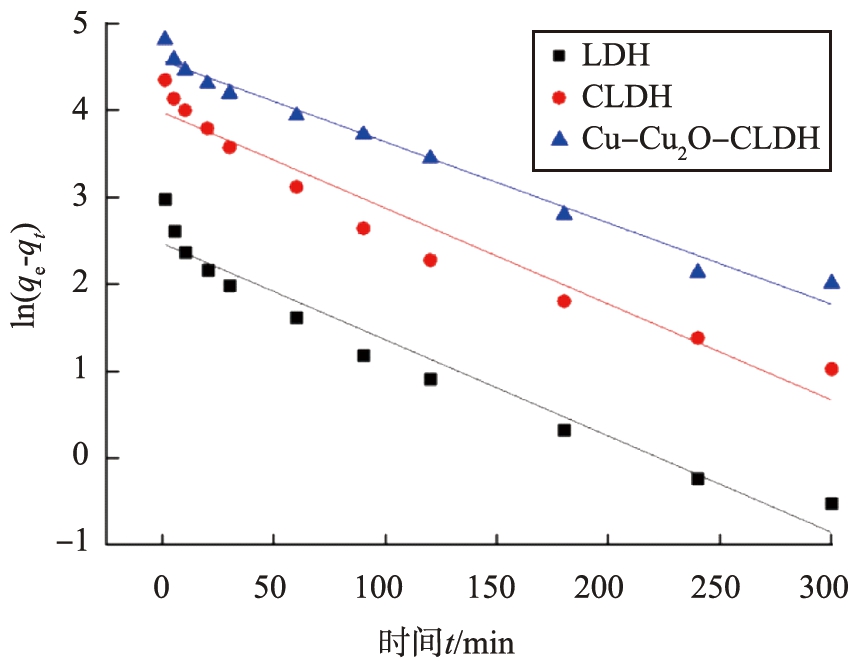 图5为3种材料对I-的吸附动力学曲线图。由图可知,在25 ℃、I-质量浓度为250 mg/L时,LDH、CLDH、Cu-Cu2O-CLDH对I-的饱和吸附容量分别达到23.2、82.6、127.4 mg/g,与理论吸附容量的趋势相同。在相同时间段内,Cu-Cu2O-CLDH对I-的吸附效率显著优于其他2种LDH材料,更适合用于水体中I-的吸附。