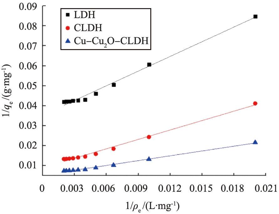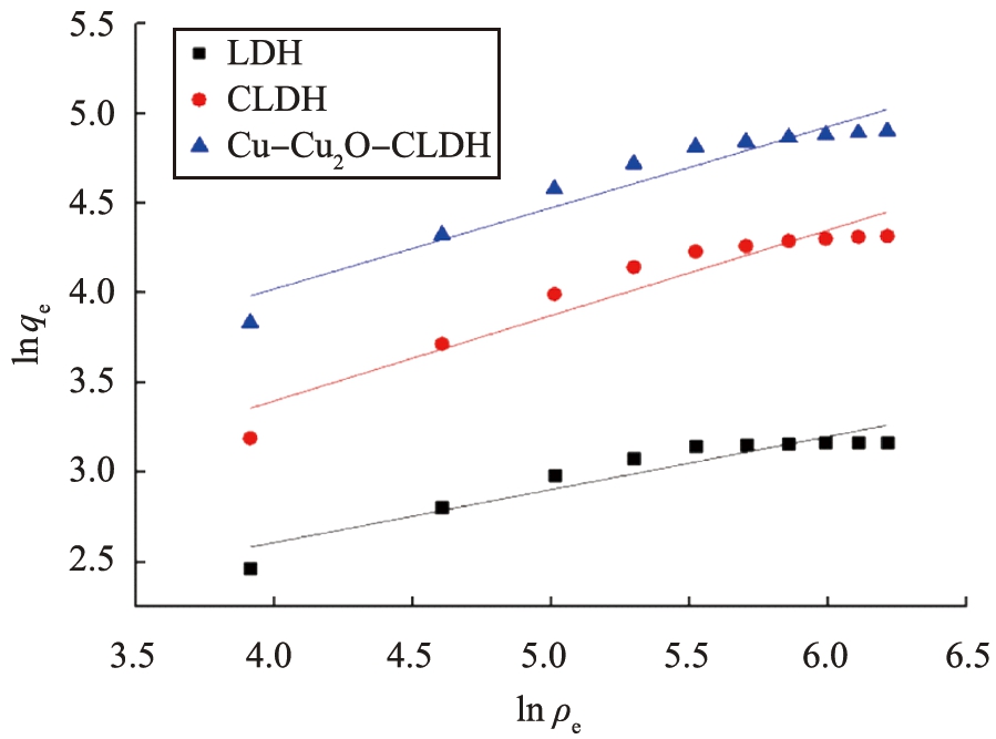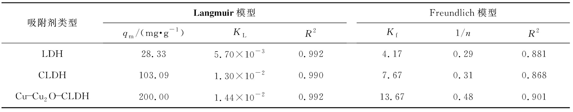 由表2可以看出,3种吸附剂对I-的吸附都能用Langmuir模型很好的拟合,其相关系数均达到0.99以上,明显优于Freundlich模型的拟合结果,因此,可以推测LDHs材料对I-的吸附为单层吸附[18]。同时,根据模拟结果,发现LDH、 CLDH、 Cu-Cu2O-CLDH对I-理论最大吸附容量分别达到28.33、 103.09、 200.00 mg/g。