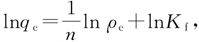 根据实验所得到的数据,对其分别利用Langmuir模型和Freundlich模型进行拟合,所得到的图像如图4所示。 拟合所得等温线常数及统计参数列于表2中。