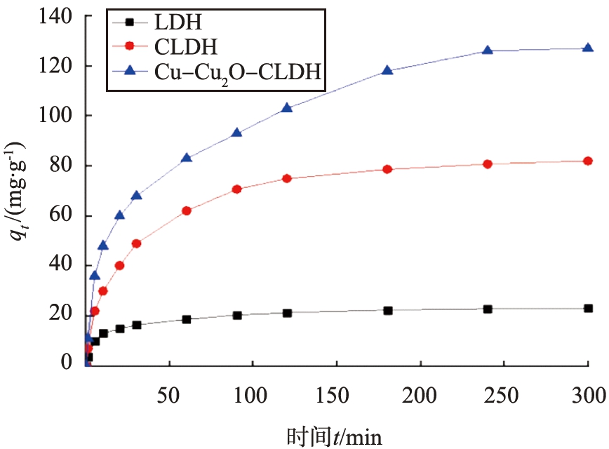 吸附动力学实验如下:在反应温度为25 ℃、 溶液pH=7的环境下,向200 mL初始质量浓度为250 mg/L的I-溶液中,分别加入0.2 g LDH、 CLDH、 Cu-Cu2O-CLDH,在不同时间分别取样,测其波长位于227 nm处的吸光度,并计算I-的吸附容量。