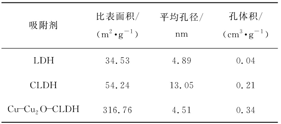 吸附剂比表面积/(m2·g-1)平均孔径/nm孔体积/(cm3·g-1)LDH34.534.890.04CLDH54.2413.050.21Cu-Cu2O-CLDH316.764.510.34