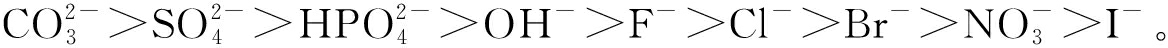 由XRD图谱及BET测试结果可以推测,LDH材料主要通过层间的阴离子交换达到吸附I-的目的。而LDH的离子交换能力主要取决于层间阴离子和客体阴离子与LDHs层板作用力的强弱,LDHs对阴离子亲和力大小顺序[16]为:由于LDH层板对