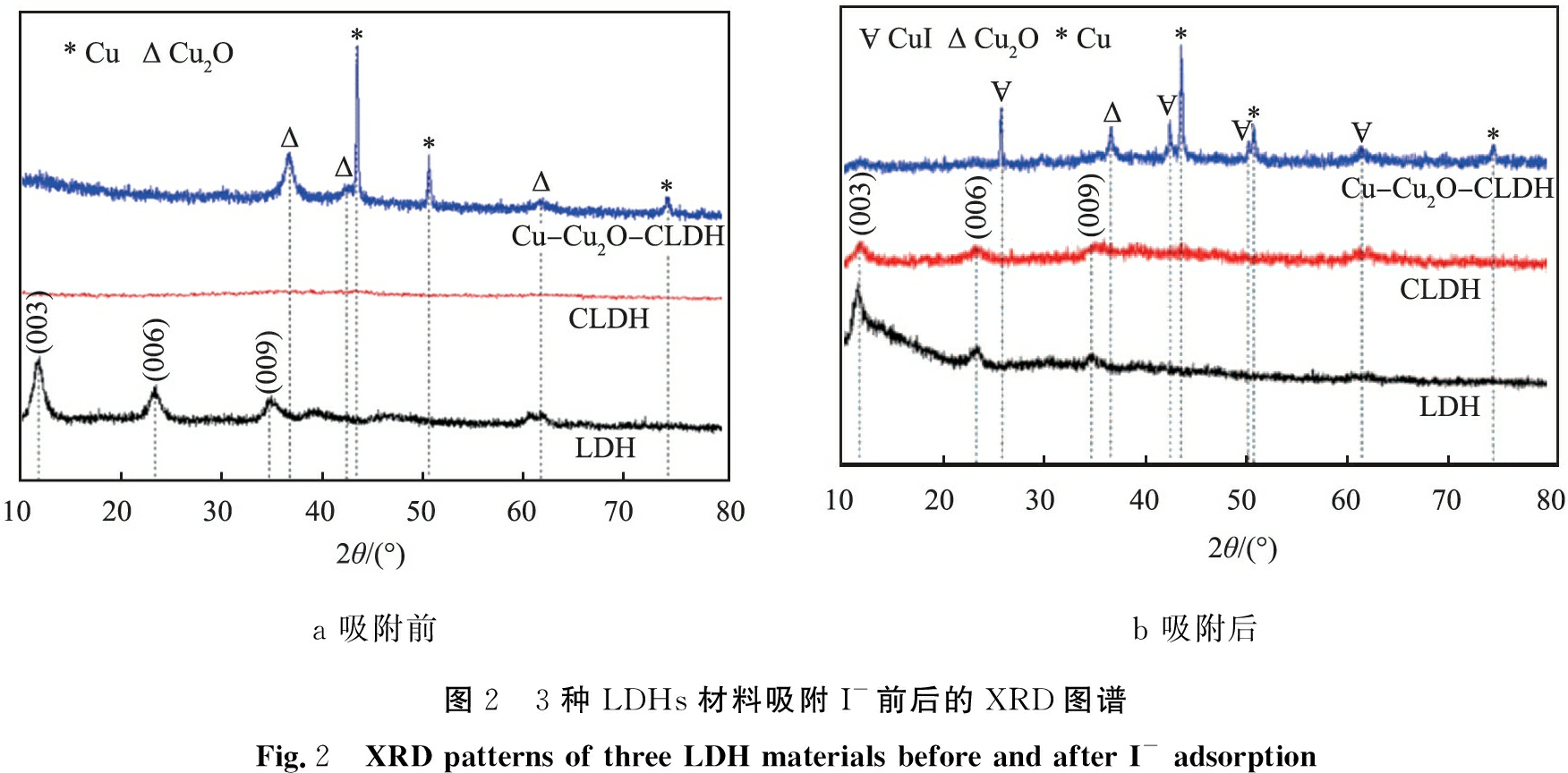 在11.6°、 22.3°、 34.9°出现了3个强度较大的特征衍射峰,分别对应LDH材料的(003)、 (006)、 (009)峰面,表明成功制得了Cu-Mg-Al LDHs材料。LDH样品经高温煅烧后,失去大量层间阴离子及水,从氢氧化物相转变为氧化物相,特征峰消失,形成CLDH材料。Cu-Cu2O-CLDH的XRD图谱显示,在36.5°、42.3°、61.4°及43.3°、50.4°、74.1°分别出现Cu2O(JCPDS 65-3288)及Cu(JCPDS 65-9743)的特征峰,表明在CLDH的基础上有Cu和Cu2O生成,成功制得了Cu-Cu2O-CLDH材料(见图2a)。 图2b表明,CLDH材料在吸附I-之后在小角度出现了LDH材料的特征峰,这表明该材料吸附I-之后恢复了LDH材料的层状结构,即CLDH材料的“记忆效应”。而Cu-Cu2O-CLDH在吸附碘离子之后,在25.7°、 42.4°、 50.1°、 61.4°处出现了CuI的特征峰(JCPDS 06-0246),表明该材料对I-吸附成功。