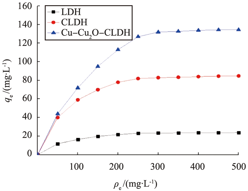 3种材料在25 ℃下对I-的等温吸附曲线如图3所示。从图中可以看出,随着I-的浓度增加,3种吸附剂对I-的吸附量也呈增加趋势。LDH、CLDH、Cu-Cu2O-CLDH对碘离子的最大吸附容量分别达到了23.8 、84.8、134.5 mg/g。由于煅烧增大了CLDH的比表面积,使得CLDH能够提供更多的活性位点用于吸附I-。同时,由于CLDH特有的“记忆效应”,使得材料对I-的吸附性能进一步提升。Cu-Cu2O-CLDH除了拥有比LDH、CLDH更大的比表面积提外,表面的Cu、 Cu2O还能够与I-发生特异的氧化还原反应,大大提升了Cu-Cu2O-CLDH对碘离子的吸附容量。