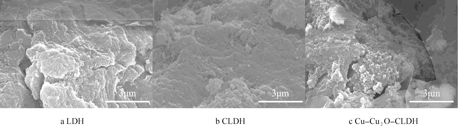 3种材料LDH、 CLDH和Cu-Cu2O-CLDH的扫描电镜(SEM)图像如图1所示。 从图中可以看出,3种材料均呈现出层状结构。从图1a可以看到,LDH纳米片呈高度交连层状结构。 而LDH经过高温处理后得到的CLDH材料,虽然失去了层间水及层板间阴离子,层板上阳离子由氢氧化物相转变为氧化物相,但是其结构仍保持完好,依然呈现出层状结构,如图1b所示。 图1c显示了CLDH材料在经过还原后依然保持较好的层状结构,且在表面均匀分布着Cu及Cu2O颗粒,表明已经成功制得了Cu-Cu2O-CLDH材料。