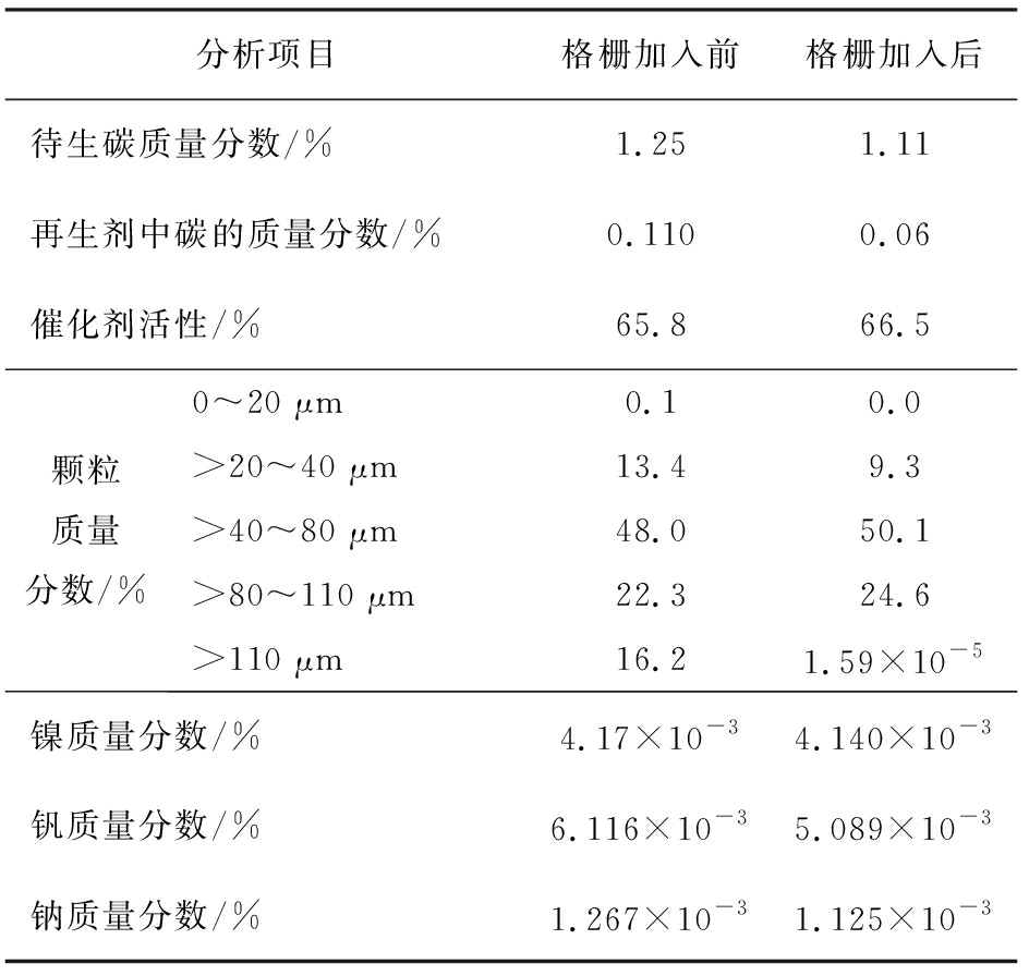 分析项目格栅加入前格栅加入后待生碳质量分数/%1.251.11再生剂中碳的质量分数/%0.1100.06 催化剂活性/%65.866.5颗粒质量分数/%0~20 μm0.10.0>20~40 μm13.49.3>40~80 μm48.050.1>80~110 μm22.324.6>110 μm16.21.59×10-5镍质量分数/%4.17×10-34.140×10-3钒质量分数/%6.116×10-35.089×10-3钠质量分数/%1.267×10-31.125×10-3