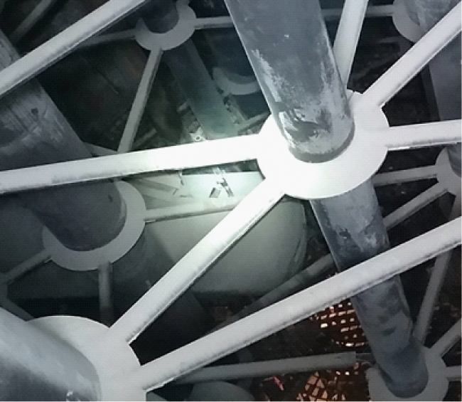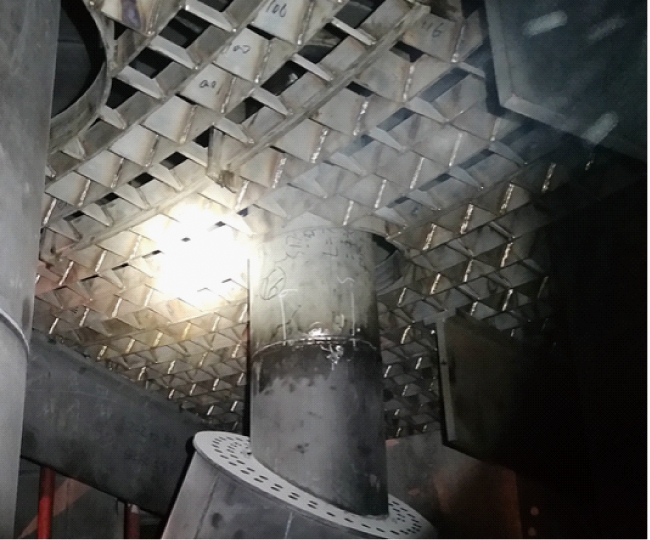 再生器内作业空间狭窄,内部构件较多(见图3和图4),这些都增加了安装难度。为了方便安装,格栅层被分为多块,各格栅块之间通过紧固螺栓和卡件焊接在一起,格栅层上留有供旋风分离器料腿穿过的圆孔。放置格栅的支梁生根在再生器器壁,需焊接支梁的部位需先剔除衬里,焊接后再重新手工补衬,支梁要求双面满焊并探伤。整个格栅层放置在水平支梁上,考虑到热膨胀格栅层与再生器器壁之间也留有足够的间隙。为不影响格栅安装二级旋风器翼伐下移600 mm。