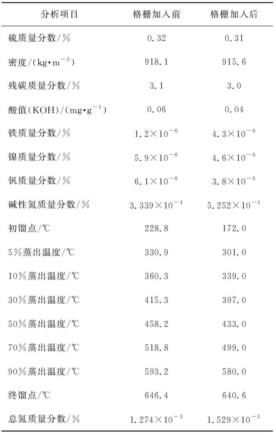 分析项目格栅加入前格栅加入后硫质量分数/%0.320.31密度/(kg·m-3)918.1915.6残碳质量分数/%3.13.0酸值(KOH)/(mg·g-1)0.060.04铁质量分数/%1.2×10-64.3×10-6镍质量分数/%5.9×10-64.6×10-6钒质量分数/%6.1×10-63.8×10-6碱性氮质量分数/%3.339×10-45.252×10-4初馏点/℃228.8172.05%蒸出温度/℃330.9301.010%蒸出温度/℃360.3339.030%蒸出温度/℃415.3397.050%蒸出温度/℃458.2433.070%蒸出温度/℃518.8499.090%蒸出温度/℃593.2580.0终馏点/℃646.4640.6总氮质量分数/%1.274×10-31.529×10-3