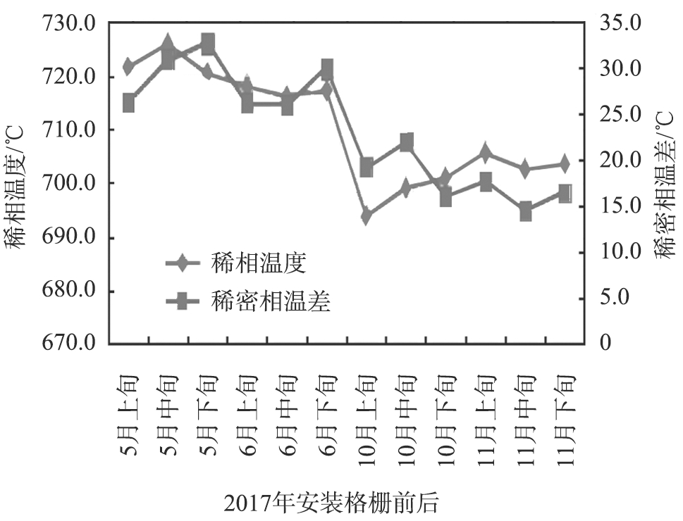 图7是格栅加入前后稀相温度和稀密相温差的变化趋势图。从图7可以看出,安装格栅后稀相平均温度从719.8 ℃降低至700.9 ℃,稀密相平均温差从28.6 ℃减小至17.6 ℃,稀相尾燃明显缓解。格栅加入后,每吨原料助燃剂的用量从33.2 g减少至22.3 g。按照这个比例计算,中国石化石家庄炼化公司催化裂化再生器每年可以节约340万元的助燃剂。