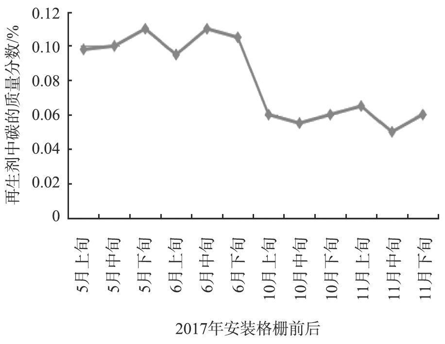 图6是格栅加入前后再生剂含碳量的变化趋势图。由图可以看出,在格栅加入前,再生剂含碳量大于0.1%;而格栅加入后,再生剂含碳量变为0.06%左右。再生剂含碳量的降低表明格栅的加入能够有效的提高再生器的再生效率。
