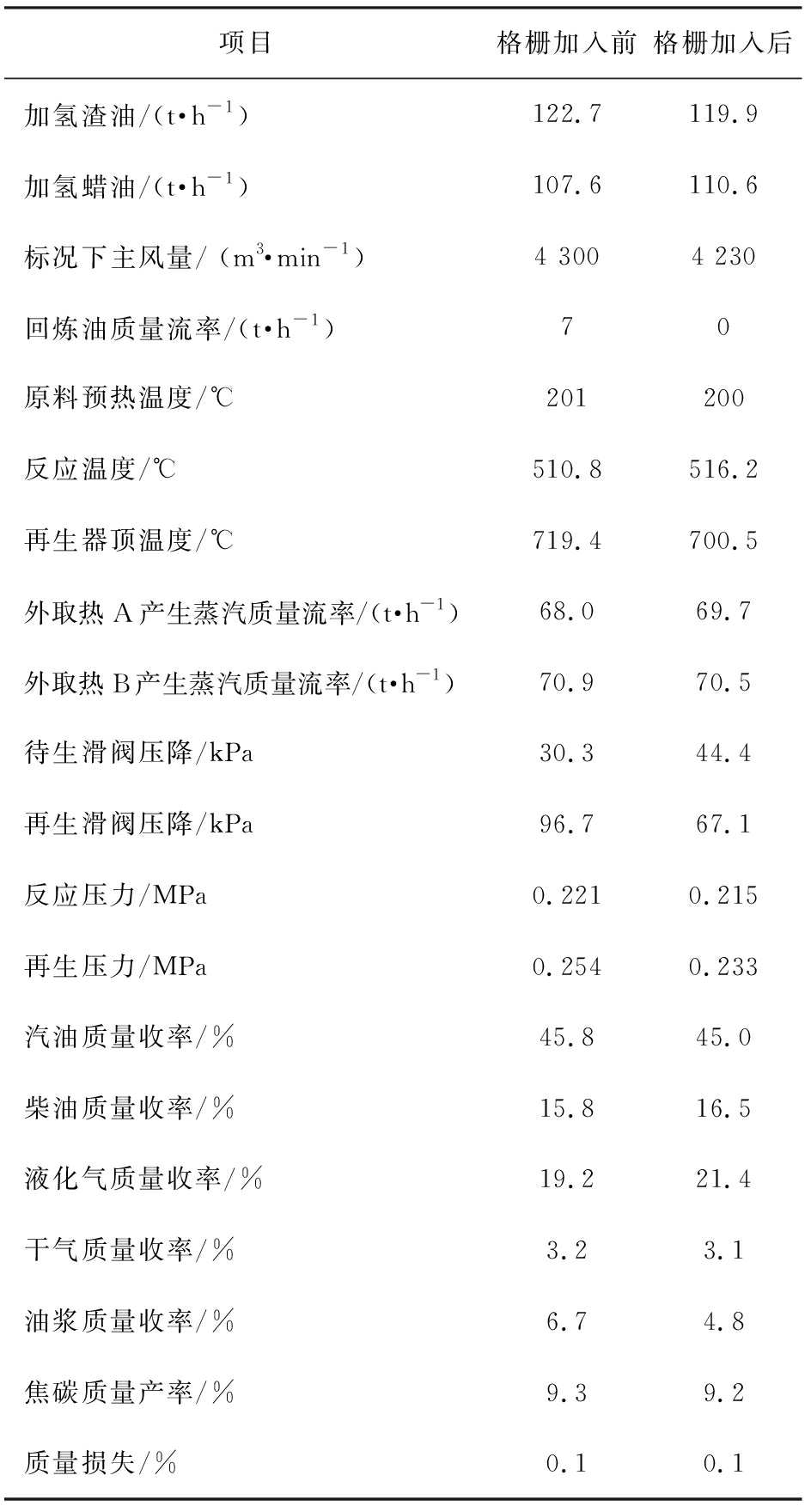 表3给出了加入格栅前后装置主要操作参数的变化情况。由表3可以看出,格栅加入前后装置的处理量都在230 t/h左右。格栅加入后装置主风量稍有下降。因反应深度增加,停回炼油回炼,导致格栅加入后装置反应温度比之前增加了5.4 ℃。